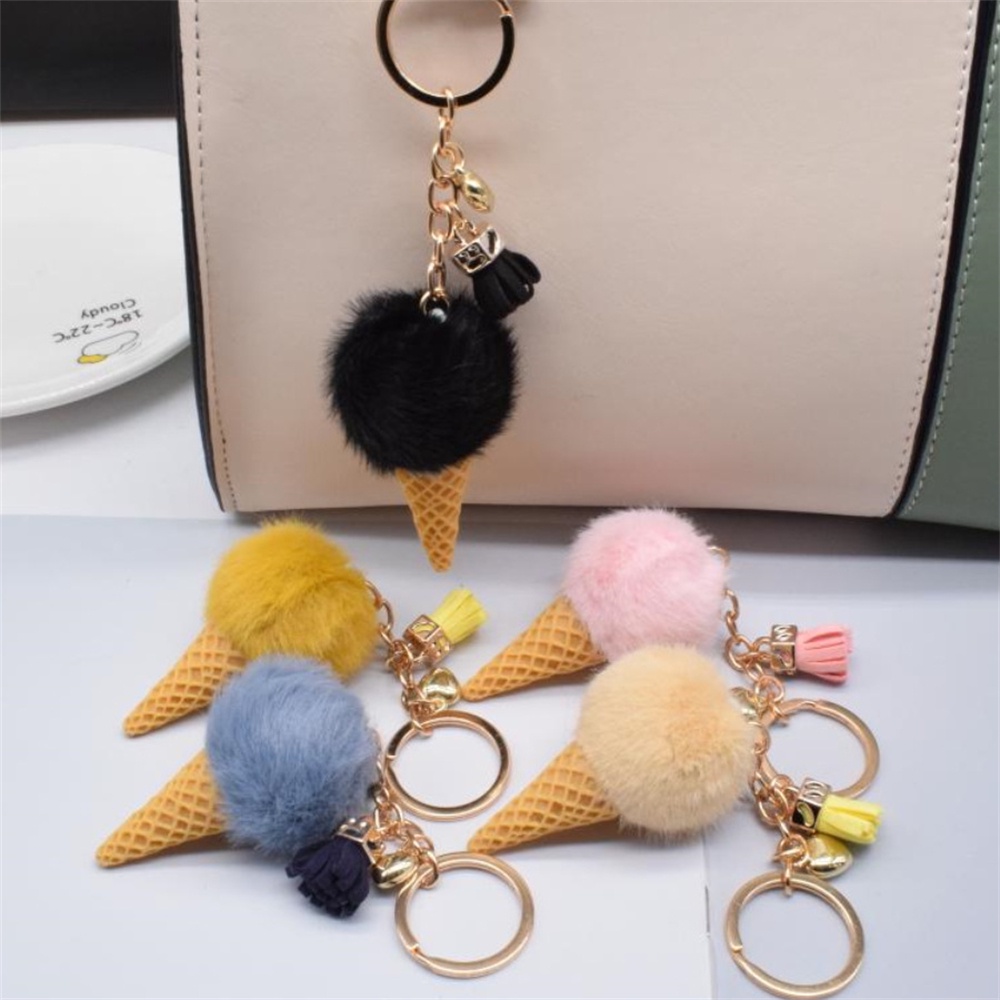1pc Cute Mini Ice Cream Pom Pom Keyring With Tassel Fashion Student Fluffy Velvet Plush Keychain For Girls Bag Decoration Gift