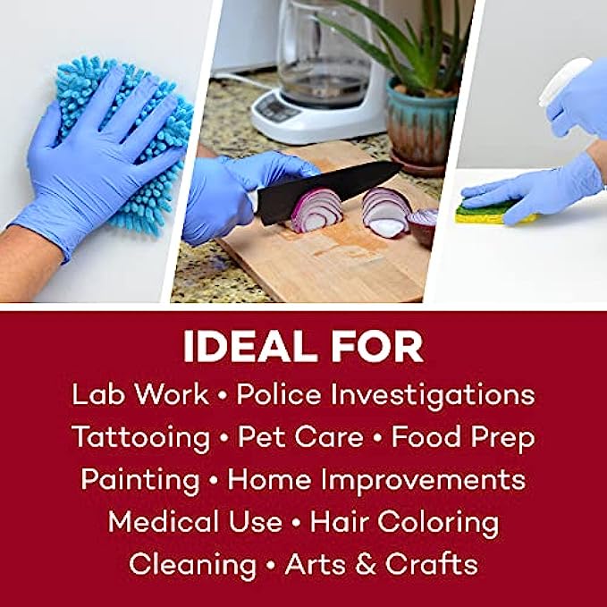 MULTI-PURPOSE GLOVES – Bulk nitrile gloves are ideal for all-purpose medical use, police investigations, lab work, hair coloring, tattooing, food prep, painting, cleaning, pet care, home improvements, hobbies, and arts & crafts.
