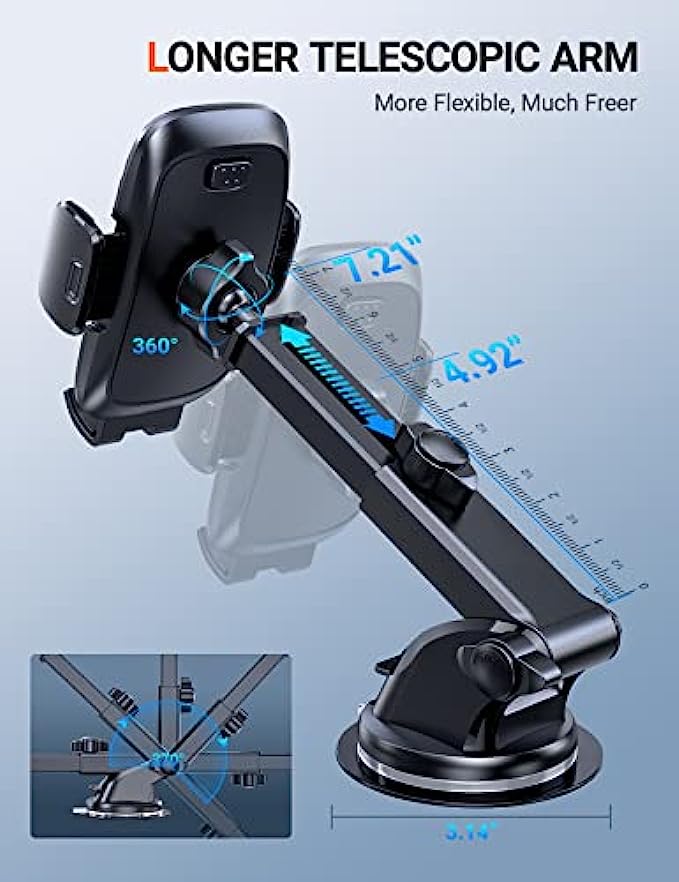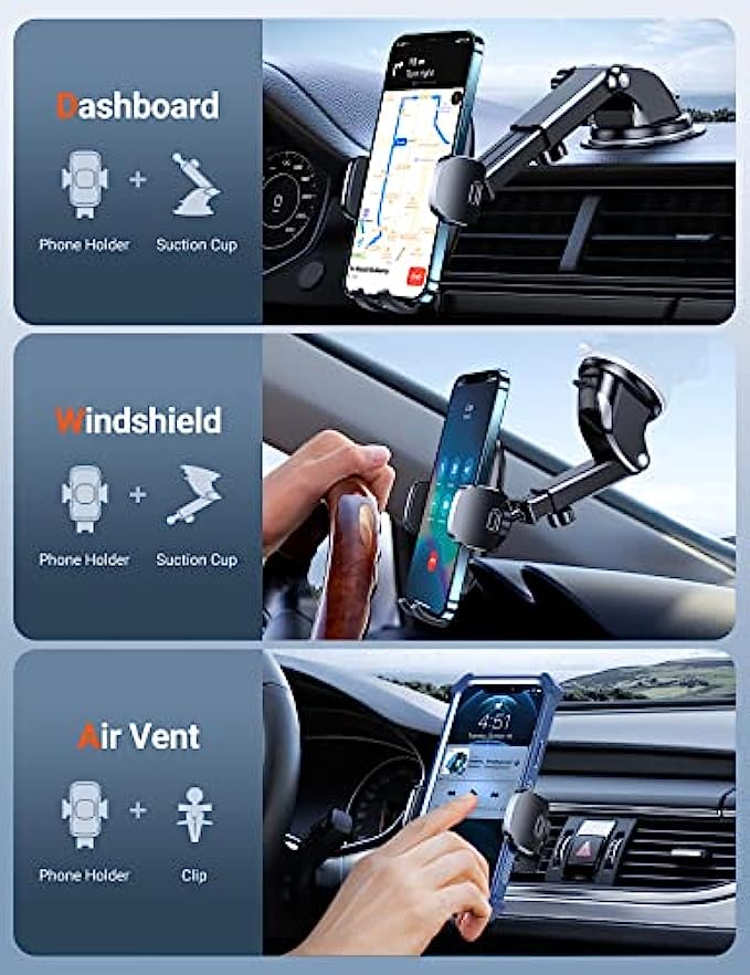 • ▶[4 IN 1 ULTIMATE CAR MOUNT]: Are you not sure which installation method is better for your car? No worries! The 4 in1 phone mount for car can be flexible placement! Dashboard & Windshield & Air Vent & Home, all places work perfectly! Also, with low temperatures in winter and heat in summer, you can choose to avoid the issue caused by environmental influences.