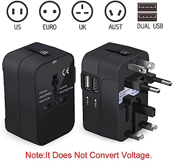 UNIVERSAL WORLDWIDE CHARGING - This travel adapter Accepts Plugs from More than 150 Countries with US/EU/UK/AU european Plugs like Thailand, New Zealand, Israel, Italy, Rome, France, Spain, Canada, China, Australia, India, Hong Kong, Argentina, Peru, Korea, Asia, etc SAFETY PROTECTION - this International Travel Power Adapter built-In safety shutters protect users from the direct touch of the live parts on the socket outlet All IN ONE - Detachable charger includes 5 Different Input Plugs Tightly Connect into 1 Adaptor DUAL USB CHARGING PORTS - World Adapter Plug compatible with almost all USB Devices like Apple iPhone x 8 8 plus 7 7s 6 6s 5s 4s, Sony, Blackberry, HTC, Lenovo, LG, ZTE, Huawei, and so on. SPECIFICATIONS - Power Rating 6A max. 100-240Vac (660W max. at 110Vac. 1380W max. at 230Vac) This Charger Adapter Plug Converts the Power Outlet Only, It Does Not Convert Electrical Output Current and Voltage. MIZO offers 24-Months limited product warranty and 24h*7d Customer Service from MIZO