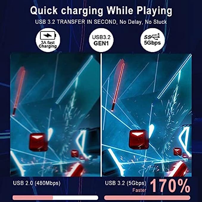 【Quickly Data Sync & Charging Speed】This quest link cable usb c to usb c supports USB 3.2 Gen 1 with 5Gbps stable and high-speed data transmission. No lag and Low latency. 3A fast charge VR headsets while playing simultaneously. No power worries and saving charging time.