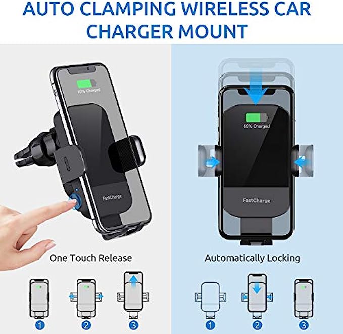 【QI WIRELESS CHARGER】Built-in upgraded chip, CHGeek wireless car charger intelligently identify and charges your device with the fastest speed in safe. Support max 15W max Fast Charger for LG V50 / V35 / V30, 10W Fast Charger for Samsung Galaxy S20/S20+, Max 7.5W Fast Charger for iPhone 11/11 Pro Max/1XS Max/XS/X, 5W for Other Qi-Enabled Phones.For 15W 10W, 7.5W fast charging mode, QC 3.0 car charger adapter is required as its power source.(1 * usb c charging cable is included in the package) 【INTELLIGENT IDENTIFICATION & SMART CHARGING】When connecting to the cable, the phone car mount will automatically clamp when phone is dropped in, make your driving easier and safer. A gentle touch on the 2 sides button of the charger can make the arms open. When your phone is fully charged, the wireless car phone charger will automatically power off and protect the battery of your phone 【FOREIGN OBJECT DETECTION with LED ALARM】When there is a metal substance between the wireless car charger mount and the phone, the car wireless charger will stop charging and the red light flashes to alarm. Effectively avoid the damage of the mobile phone caused by the high temperature of the metal 【CASE FRIENDLY & FLEXIBLE ANGLE ADJUSTMENT】CHGeek phone holder for car supports charging through phones cases up to 6mm thick. Please note that cases made of metal, external attachments such as magnets, credit cards, grips, and stands will interfere with charging. The 360°rotating sphere and the retractable & foldable bracket allows for optimum viewing and safe driving 【2-IN-1 Design】 Combines the Qi Wireless Charger and a car cell phone holder, allows for a secure hands-free experience. Keep you away from the tangled locating cords or cables. Cell phone holder is suitable for car Windshield Dashboard Air Vent installation, and makes GPS and phone call more convenient