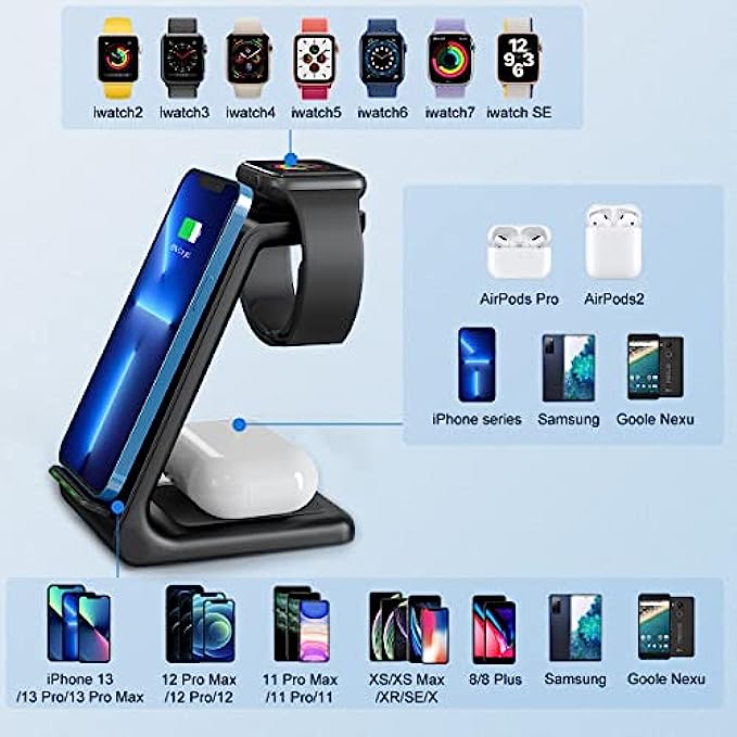 • "U"-PLATE DESIGN 3 IN 1 WIRELESS CHARGER: Only 0.47 inch thickness size with “U”-plate design and 4.8 oz weight, you can put it to the pocket. Also GEEKERA wireless charger dock can charge iPhone 13/13 Pro/13 Pro Max/12/12 Pro/12 Pro Max/11/11 Pro/11 Pro Max/8/8 plus/XS MAX/XR/X/XS/SE or Samsung phone, Apple watch 7/6/SE/5/4/3/2 and AirPods 3 pro 2 or Galaxy earbuds simultaneously(Note: Not suitable for iPhone 13 Mini/12 Mini/Airpod gen 1). Different from other wireless charging dock. Wireless charging dock haven’t the issue of” toggling between charging/not charging non stop”.