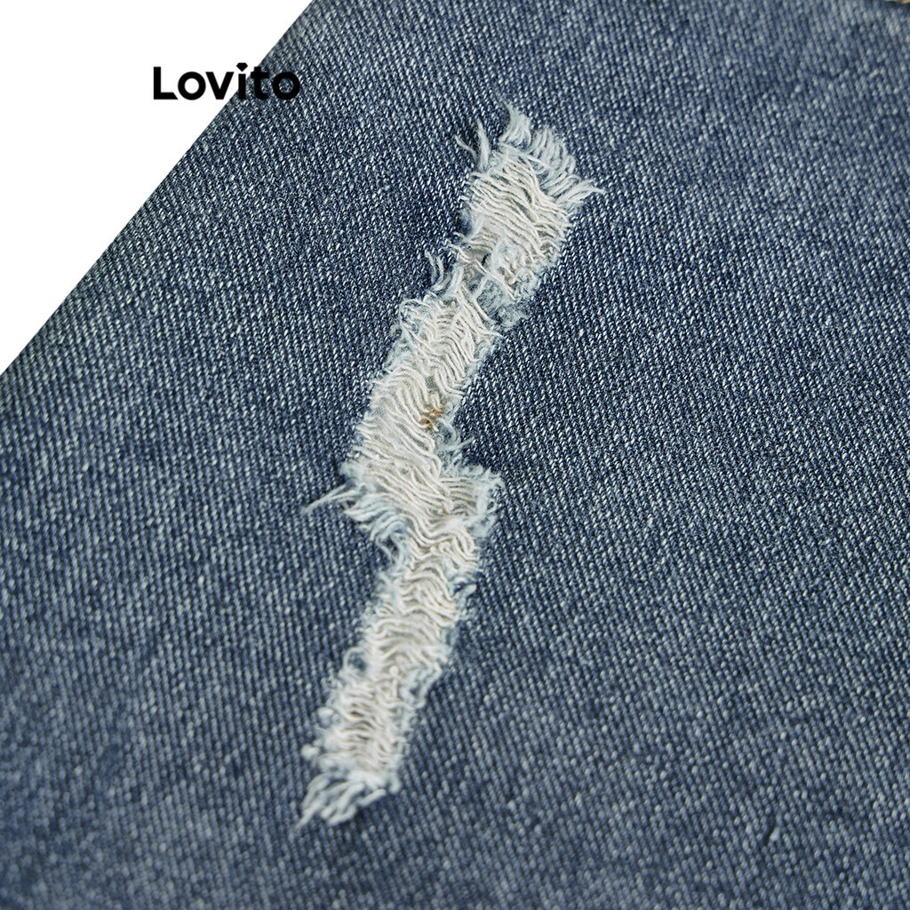 Lovito Casual Plain Asymmetrical Spiked Washed Denim Shorts for Women LBL05230 (Blue)