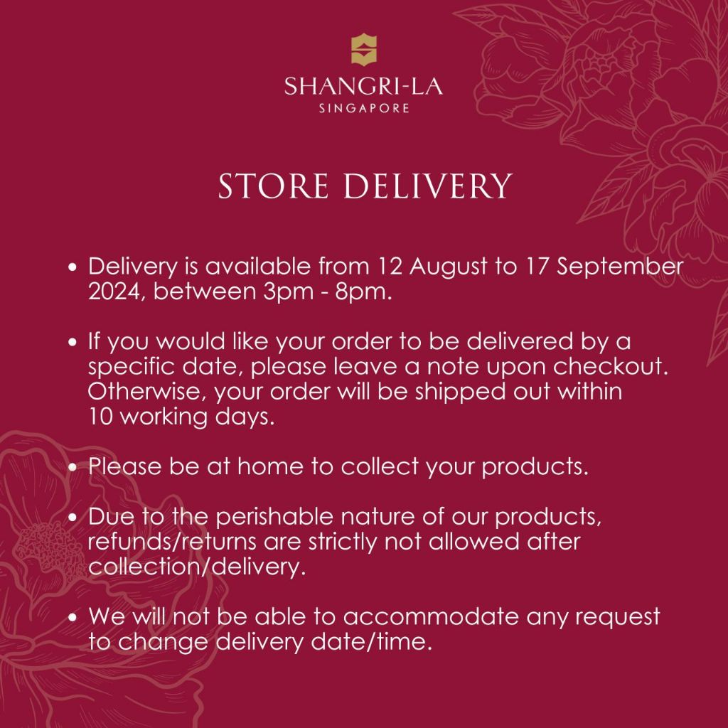 I collected it personally @ Shangri La Hotel Singapore yesterday with a beautiful box with the words Shopee and Shangri La printed. Live the four limited Mooncakes and will eat to taste later today. Thank you for the promotional price